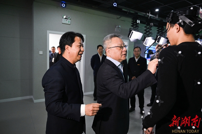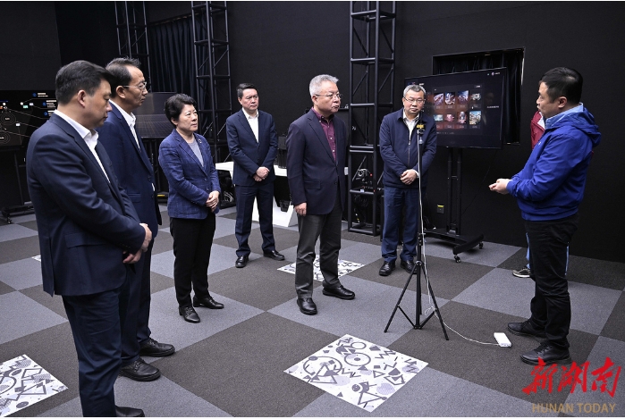 走進馬欄山視頻文創(chuàng)產(chǎn)業(yè)園,沈曉明考察了樂田智作9號棚、馬欄山視頻超算中心、聚恒科技園、5G高新視頻多場景應用國家廣電總局重點實驗室、萬興科技大模型研發(fā)中心,詳細了解節(jié)目生產(chǎn)全流程、軟硬件研發(fā)、超算和大模型賦能音視頻產(chǎn)業(yè)發(fā)展、動漫產(chǎn)業(yè)集聚和創(chuàng)新平臺研發(fā)應用等情況,并在明和光電察看了智能化裝備,了解舞臺機械、藝術燈光等文旅裝備創(chuàng)新研發(fā)情況。他指出,要充分發(fā)揮頭部企業(yè)帶動作用,招引更多文化和科技融合的上下游企業(yè)和資源要素集聚湖南,進一步提高關鍵領域自主創(chuàng)新能力,實現(xiàn)國產(chǎn)化替代,并提供一站式服務解決方案,打造永不落幕的音視頻裝備展。